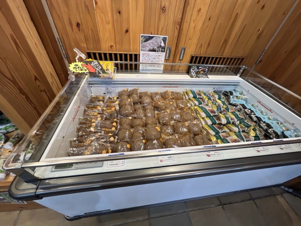 岩国市錦町の名物こんにゃくを使った商品も充実しています。そのほか、ジビエやお土産にぴったりな品も並んでいます。
