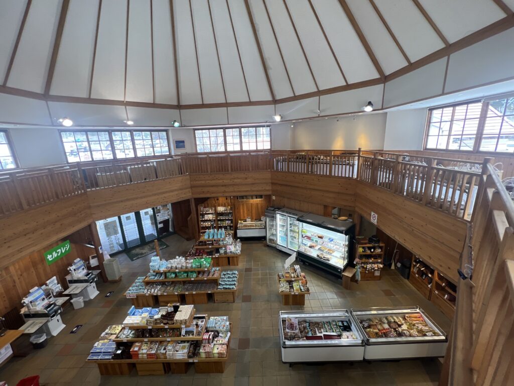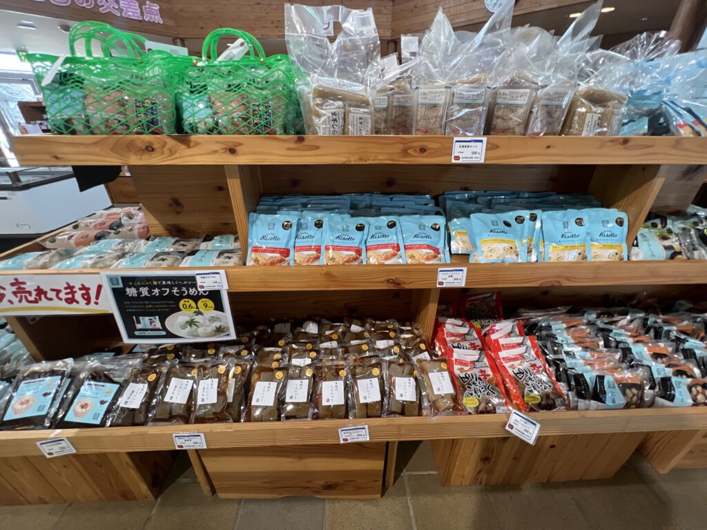 物産販売所には、新鮮な地元野菜やさまざまな加工食品がそろっています。