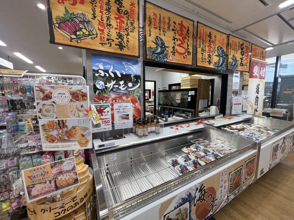 飲食・物販エリアでは、地元産の野菜や季節限定の新米、弁当(海鮮丼、駅弁、鯖寿司など)、さらに冷蔵・冷凍の魚介類など多彩な海産物が揃っています!