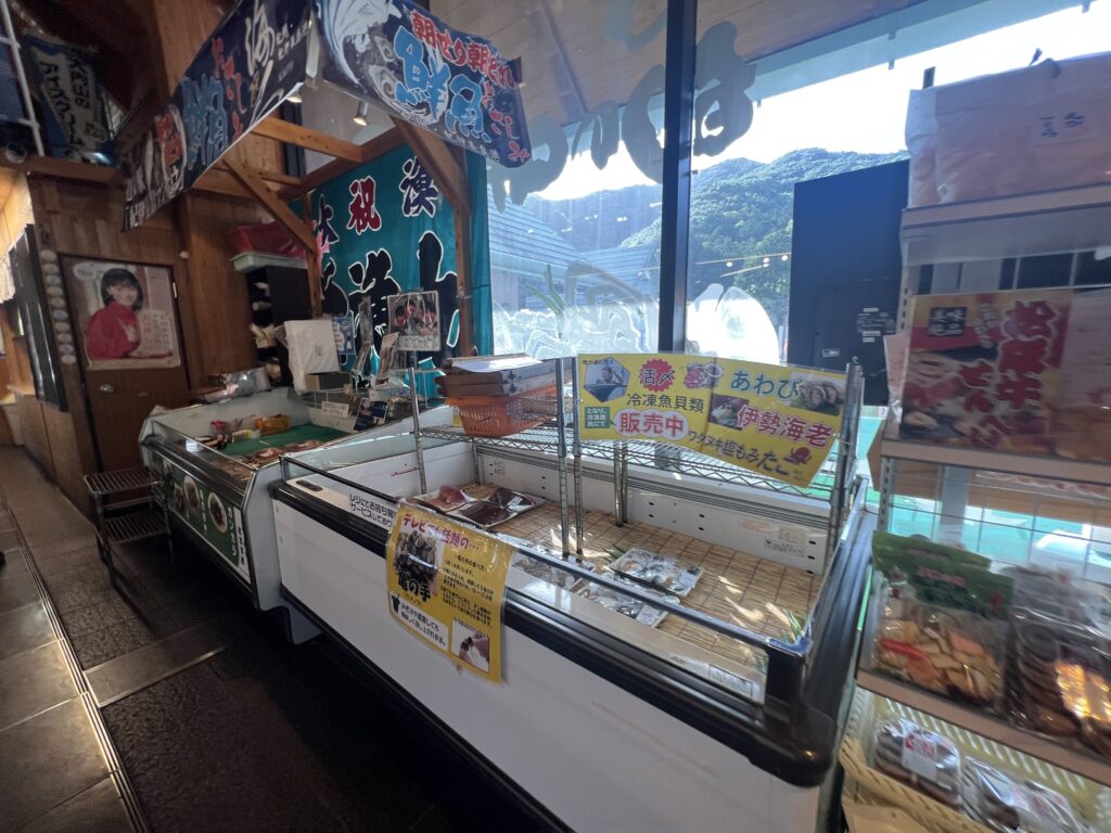 売店では、三重県紀北町の特産品や海の幸が販売されています。