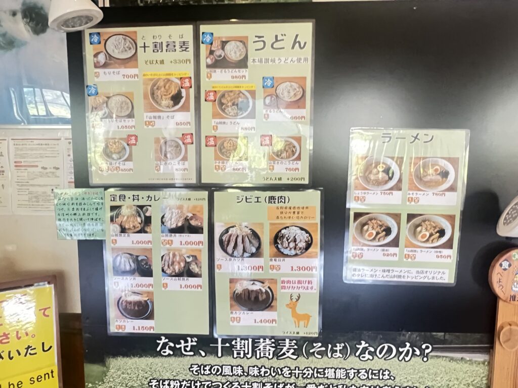 定食メニューのほか、自家製の十割蕎麦や松本名物の山賊焼き、ジビエ(鹿)料理など、地元の味を楽しめます。
