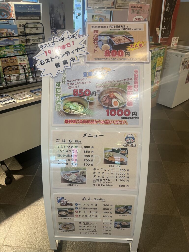 | 営業時間 | 売店 7:30~20:30 レストラン 麻の里 ランチタイム 11:30~14:30(オーダーストップ 14:00) ディナータイム 17:00~19:30(オーダーストップ 19:00) |