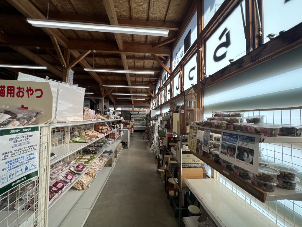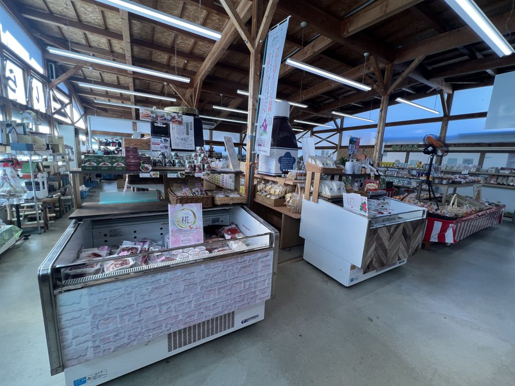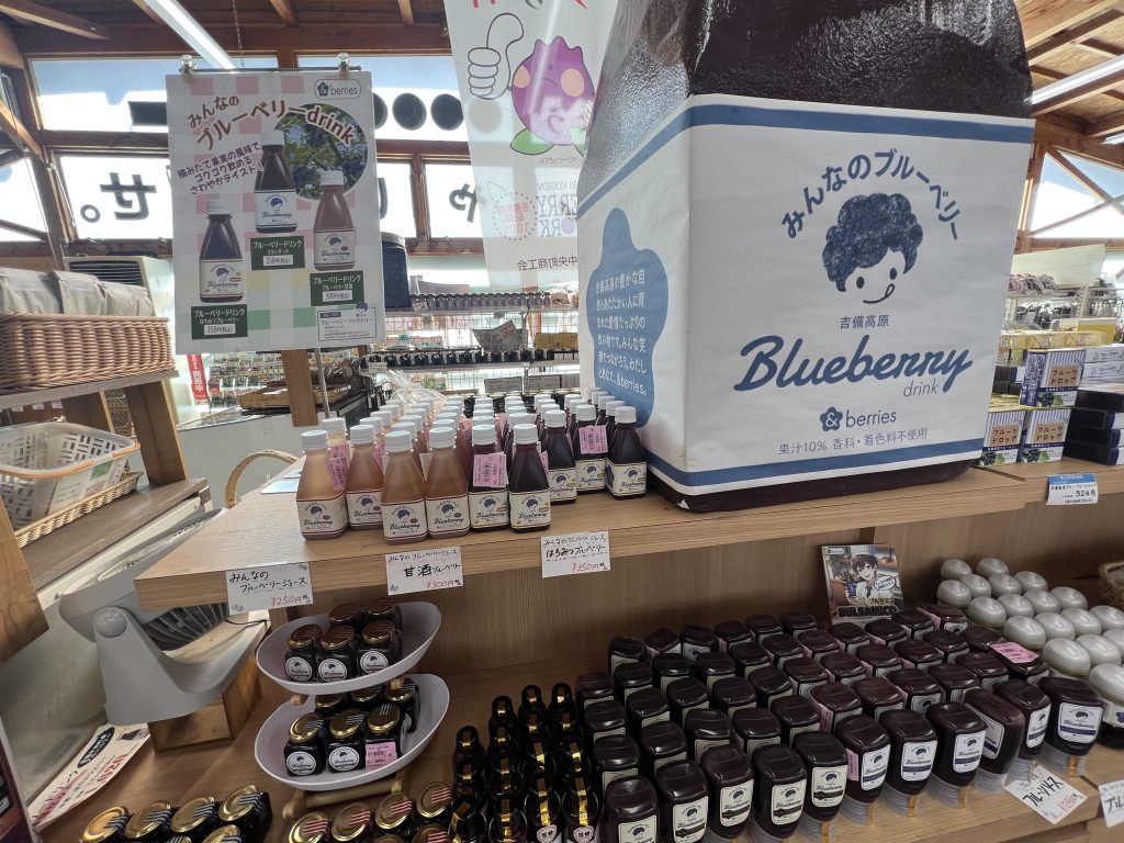 農産物直売所では、地元の新鮮な野菜や果物が並び、特にブルーベリーが名産のようで、関連商品が豊富に揃っていました。