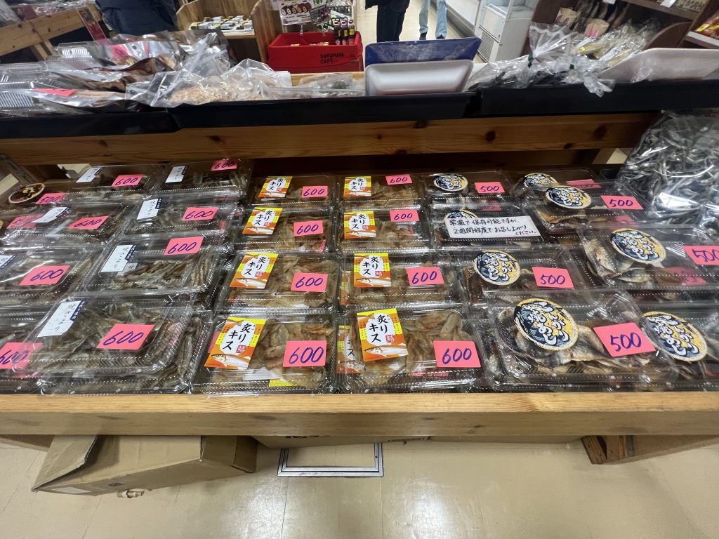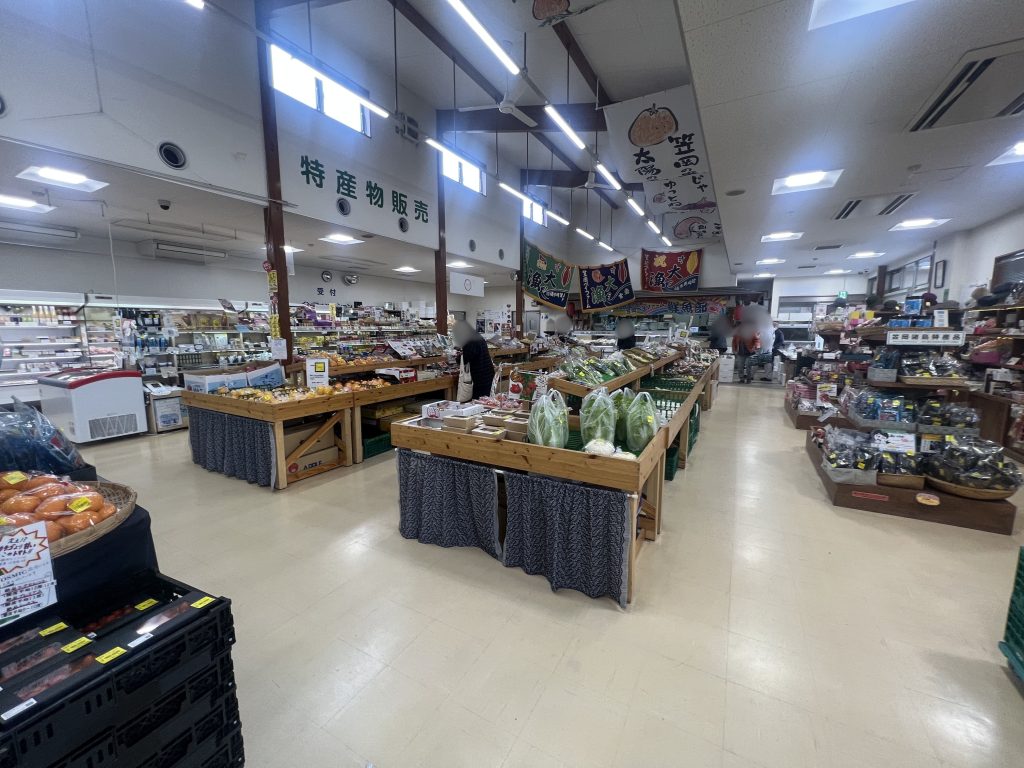 直売所には地元の特産物が豊富に揃い、新鮮な野菜や魚が並んでいます。
