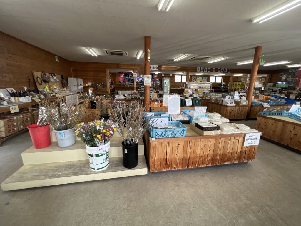 産直市「ぶなの里」には、地元で採れた新鮮な野菜や花の苗が並びます。名物のとんばら味噌はお土産にもおすすめです。