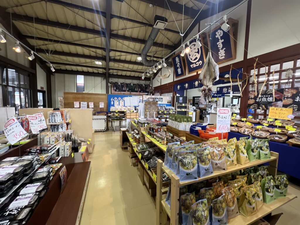 海産物販売所では鮮魚のほか、干物や加工品、魚を使った惣菜も充実しています。